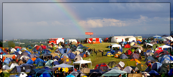 Tja, jetzt ist es schon wieder vorbei. Viel zu schnell, wie jedes Jahr. Dafür hatten wir in diesem Jahr aber von allem etwas: Viel Regen, viel Wind, viel Sonne, viel Kälte und sogar einen Regenbogen. Wir hatten den langen und kurvenreichen traditionellen Weg und erstmals die kurze und steile Treppe, die trotz Konditionsschwächen beim gemeinen Metaller rege benutzt wurde. Ebenfalls zum ersten Mal gab es Pfandmarken, was sich auch bewährt hat. Und wieder mit dabei: der extrem leckere Freßstand, an dem es allerhand Köstlichkeiten zu günstigen bis angemessenen Preisen zu erstehen gab. Sogar Frühstück gab es morgens. Und alles so lecker, daß die Leute auch längere Anstehzeiten in Kauf nahmen, während der Dönerstand nebenan weitgehend leer ausging. Die Dixies waren immer sauber und oft war sogar noch Klopapier drin. Zudem waren sie dieses Jahr weitestgehend umkippsicher aufgestellt. Einziges Manko: Einige Dixies standen schon arg schief und der Bereich zwischen Dixies und Hang ist immer sehr durchnäßt und matschig. Vielleicht könnte man da einfach mal einen Ballen Stroh verteilen.