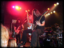 Die Schweden Amon Amarth interessieren mich von den drei Bands am wenigsten. Das ist vielleicht auch besser so, denn sonst würde mich der hundsmiserable Sound wirklich aufregen. Stellenweise hört man einfach nur Bass und die einzelnen Stücke gehen so in dem Soundmatsch unter, daß man sie kaum erkennen kann. Der Stimmung tut dies jedoch keinen Abbruch, denn Amon Amarth werden frenetisch abgefeiert. Die Wikinger vom Schicksalsberg beginnen ihren Auftritt mit dem Opener des aktuellen Albums With Odin On Our Side, dem starken Valhall Awaits Me. Man folgt zunächst dem Lauf des Albums und spielt als zweites Runes To My Memory. Anschließend gibt es neben einigen weiteren Songs Death In Fire von der Versus The World und Fate Of Nornes von der gleichnamigen letzten Platte auf die Ohren.