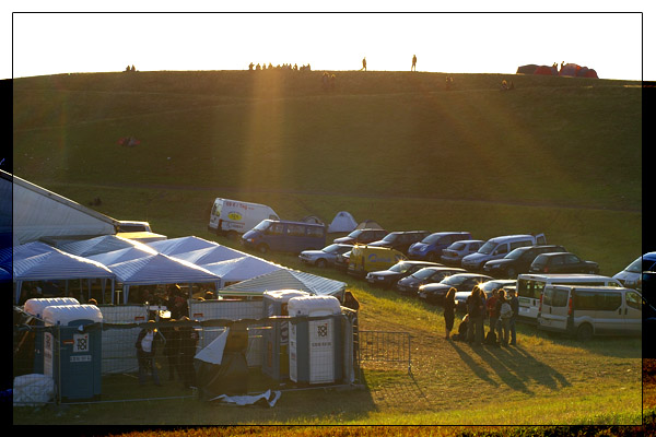 Tja, jetzt ist es schon wieder vorbei. Viel zu schnell, wie jedes Jahr. Dafür hatten wir in diesem Jahr aber von allem etwas: Viel Regen, viel Wind, viel Sonne, viel Kälte und sogar einen Regenbogen. Wir hatten den langen und kurvenreichen traditionellen Weg und erstmals die kurze und steile Treppe, die trotz Konditionsschwächen beim gemeinen Metaller rege benutzt wurde. Ebenfalls zum ersten Mal gab es Pfandmarken, was sich auch bewährt hat. Und wieder mit dabei: der extrem leckere Freßstand, an dem es allerhand Köstlichkeiten zu günstigen bis angemessenen Preisen zu erstehen gab. Sogar Frühstück gab es morgens. Und alles so lecker, daß die Leute auch längere Anstehzeiten in Kauf nahmen, während der Dönerstand nebenan weitgehend leer ausging. Die Dixies waren immer sauber und oft war sogar noch Klopapier drin. Zudem waren sie dieses Jahr weitestgehend umkippsicher aufgestellt. Einziges Manko: Einige Dixies standen schon arg schief und der Bereich zwischen Dixies und Hang ist immer sehr durchnäßt und matschig. Vielleicht könnte man da einfach mal einen Ballen Stroh verteilen.