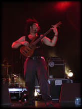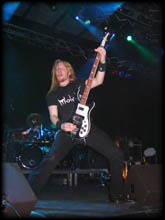 Der ungekrönte König des metallischen Hüftschwungs zieht die Konsequenz daraus und legt sich an die Leine, sprich, verkabelt sein Instrument. Zu seinem größten Bedauern kann er jetzt nicht mehr zur linken Bühnenseite laufen, aber das tut der guten Stimmung auf und vor der Bühne keinen Abbruch. Jetzt gibt es erstmal ein Manowar-Cover. Keine Ahnung, wie der Song heißt, aber die häufigsten Wörter waren die, world und hail…es kann also jeder beliebige Manowar-Song gewesen sein. Und da die ganze Zeit ein bekloppter Luxemburger rumrennt, der nichts anderes brüllt als „Ausgebombt!“ und „Sodom!“, wird das eben auch noch gespielt. Leider ist der Auftritt dann schon bald zu Ende, aber Pungent Stench sind ja gar nicht so, und spielen noch zwei Zugabenblöcke. Daß Stagediven verboten ist, stört heute nicht weiter, denn es ist ja sowieso kaum jemand da. Doch da! Ein paar rebellische Recken haben sich erdreistet und sind in den Fotograben geklettert! Sofort kommt die Security gesprungen und treibt die jungen Wüteriche zurück. Nun gut, wenn der Prophet nicht zum Berg kommen darf, kommt der Berg eben zum Propheten und Martin Schirenc spielt das Stück im Fotograben zu Ende. Beim endgültig letzten Stück der Show wird noch einmal gepost bis zum Umfallen, bevor der Gig viel zu früh endet.
