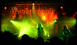 Die nun folgende Band darf man wohl mit Fug und Recht als deutsche Metal-Veteranen bezeichnen. Grave Digger beginnen ihren Set gleich mit dem Titelstück des neuen Albums Liberty Or Death. Sänger Chris Boltendahl freut sich einen Wolf auf der Bühne und man hat das Gefühl, daß er am liebsten ins Publikum springen und jeden Einzelnen umarmen würde. Das anschließende Scotland United bringt den kompletten Saal zum mitsingen und auch bei Grave In The No Man’s Land geht die ganze Halle mit. Leider entpuppen sich Grave Digger-Fans als sehr anhängliche Zeitgenossen, die einen liebend gerne bei Klassikern wie Excalibur umarmen und einem dabei laut und falsch ins Ohr brüllen. Mit The Terrible One stellt die Band ein weiteres Stück des neuen Albums vor und Herr Boltendahl ist wirklich gut drauf, sagt nahezu jeden Song an und post mit den Fans um die Wette. Da Grave Digger einen Auftritt in Headlinerlänge spielen, ihre Songs aber alle recht kurz sind, schaffen sie es, ganze 20 Songs in ihrem Set unterzubringen. Als Highlights seien hier Lion Heart, das schon einige Jahre auf dem Buckel habende Circle Of Witches, Morgane Le Fay und Knights Of The Cross genannt. Ein Stück, das natürlich auf keinen Fall fehlen darf, wird zum Abschluß des wirklich guten Auftritts von Grave Digger gespielt: Rebellion (The Clans Are Marching). Doch die Fans wollen die Band nicht gehen lassen, und so gibt es mit The Last Supper und Grave Digger eine schöne Zugabe. Aber noch immer haben die Leute nicht genug und so gibt es sogar noch eine zweite Zugabe mit The Round Table (Forever) von der Excalibur und dem schon fast antiken, aber immer noch mächtig Stimmung machenden Heavy Metal Breakdown. Am Auftritt von Chris Boltendahl kann man wirklich nicht meckern, aber die anderen hätten sich ruhig mal etwas mehr bewegen können. Trotzdem ein super Auftritt.