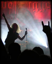 Den Schweden Therion zuzusehen ist immer wieder ein Genuß. Hier wird Musik nicht einfach nur gespielt; hier wird Musik gelebt und zelebriert. Hier wird nicht simpel musiziert, hier wird auch geschauspielert, inszeniert und werden Töne sichtbar gemacht. Bühnendekoration, Klang und Licht bilden eine untrennbare Einheit und machen nahezu jedes Therion-Konzert unvergeßlich. Auf dieser Tour hat die Band besonders aufwendige Dekorationen dabei, die die Bühne in eine andere Welt verwandeln. Beim ersten Stück kommt (fast) jedes Bandmitglied zum Bühnenrand und gibt zur Vorstellung ein kurzes Solo. Mit Der Mitternachtslöwe beginnt der Auftritt der Schweden dann richtig. Danach gibt es die (leider) einzige Ansage des gesamten Auftritts, als Mats Levén The Blood Of Kingdu ankündigt. Irgendwie sind Therion heute überhaupt nicht kommunikativ. Ein Sänger ganz besonderer Couleur ist Snowy Shaw...mal droht er seinen Mitmusikantinnen mit Schlägen, mal züngelt er mit dem Mikroständer oder erzählt anscheinend seiner Kollegin Katarina Lilja Witze, während die krampfhaft versucht, ernst zu bleiben. Und zwischendrin singt der Knabe natürlich auch, mal an vorderster Front, mal hinter den Eisenzäunen, die den Backgroundchor von der Bühne abgrenzen. Mit dem eher ruhigen An Arrow From The Sun von der Lemuria geht es dann weiter, bevor uns mit The Perennial Sophia einer der ganz starken Tracks der neuen Platte Gothic Kabbalah präsentiert wird. Die Gesangsfraktion, mit 4 Personen genauso stark wie die Instrumentalfraktion besetzt, bietet eine fantastische Leistung. Jeder hat seine Solopassagen, aber genauso übernimmt jeder auch mal den Background Gesang (oder unterhält sich während dem Singen mit den Roadies, wie Snowy Shaw). Natürlich dürfen auch Duette nicht fehlen, die von Mats Levén und Katarina Lilja perfekt und mit reichen Gesten versehen vorgetragen werden. Das epische Son Of The Sun kehrt dann wieder zurück zur Lemuria. Nach einigen älteren Songs verlassen fast alle Musiker die Bühne und Drummer Petter Karlsson beginnt ein Drumsolo.