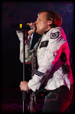 The Pride Of Creation durch die vielen 'Ausziehen!'-Rufe ganz wuschig. Also wird man mit Save Me ganz romantisch und läßt das Publikum die Feuerzeuge nach oben recken. Dann jedoch schafft es der Sänger, sich mit der ihm eigenen Leichtigkeit beim Publikum unbeliebt zu machen. Erst gibt es fiese Sprüche gegen den heiligen FCS, was dazu führt, daß Tobi mit Fußbällen beworfen wird, worüber er sich jedoch köstlich amüsieren kann. Dann setzt er jedoch noch einen drauf und lobt das Saarland als Geburtsland von Erich Honecker, was zu Buhrufen führt, die jedoch schnell in 'Ausziehen!'-Rufe übergehen. Wie auch immer das zusammenhängen mag (Argh! Diese Bilder!). Tobi jedenfalls sieht ein, daß er es mal wieder geschafft hat, die Stimmung so richtig zu drücken und um dem entgegenzuwirken gibt's jetzt ein bescheuertes edguytypisches Mitsingspiel,